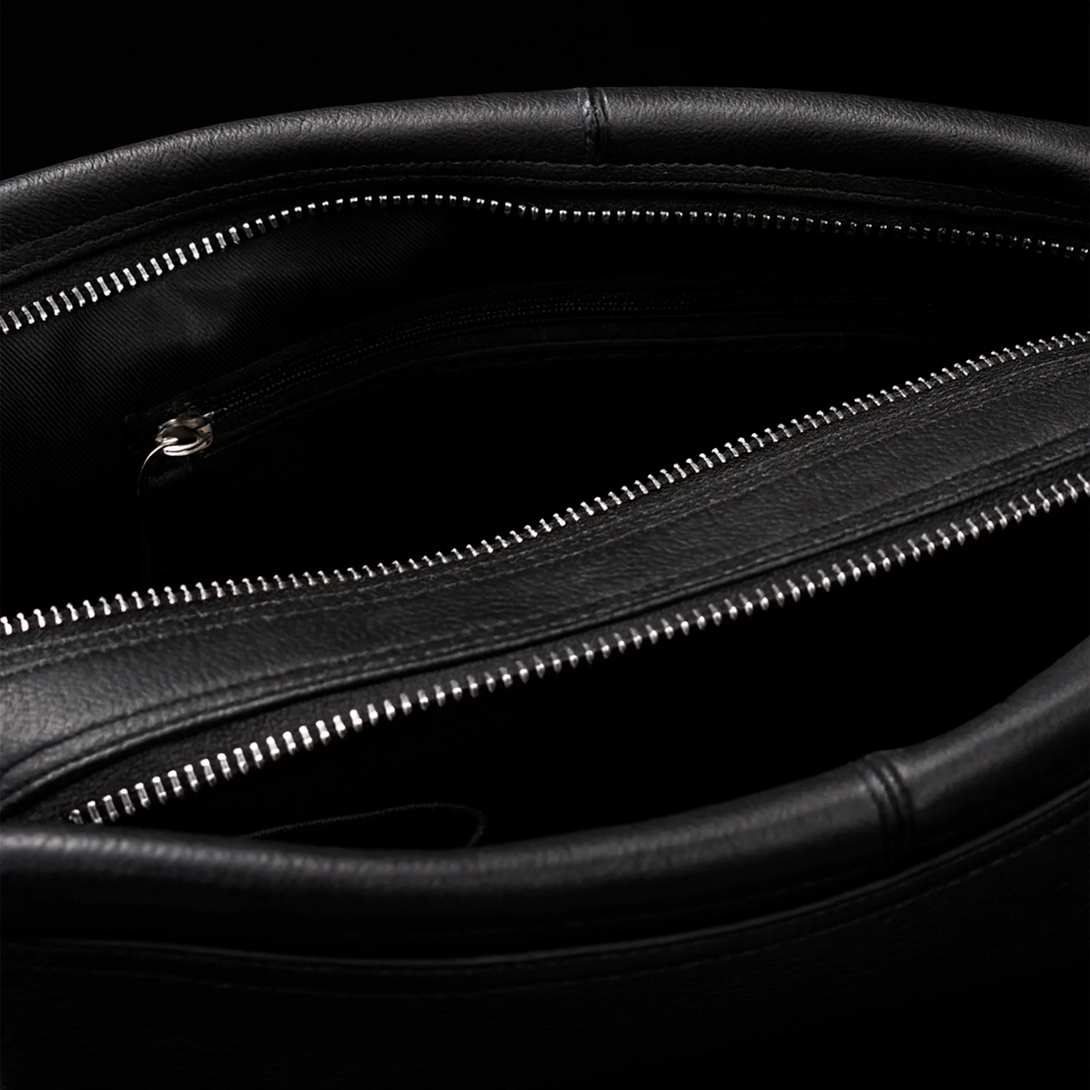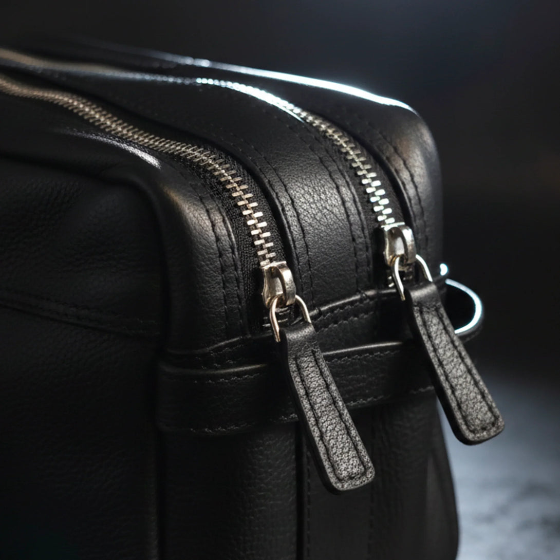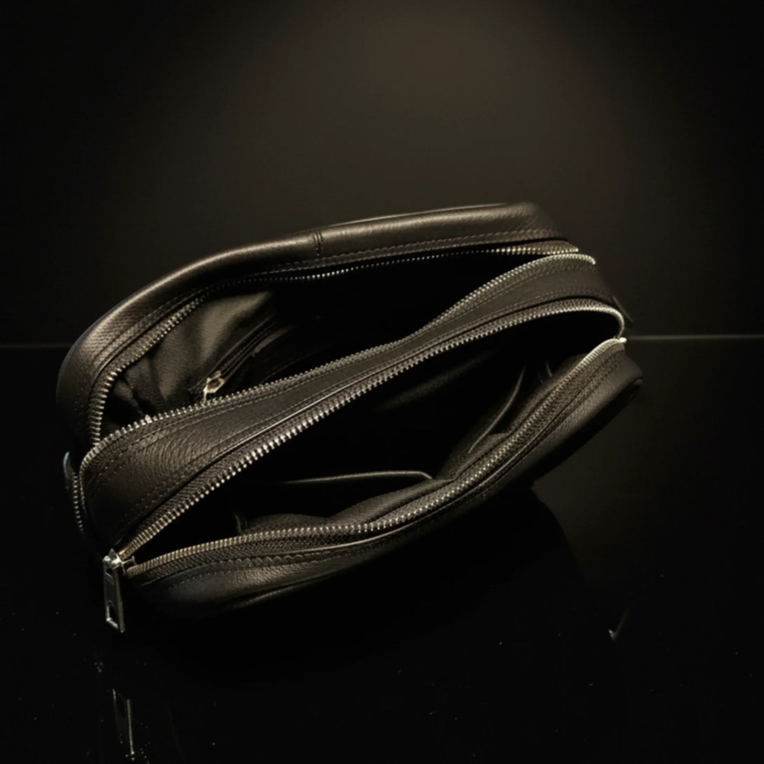 Deze ruime toilettas met twee compartimenten is gemaakt van premium volnerf rundleer in een strak zwarte afwerking. Het combineert verfijnde elegantie met robuuste duurzaamheid, waardoor het de perfecte reisgenoot is.
